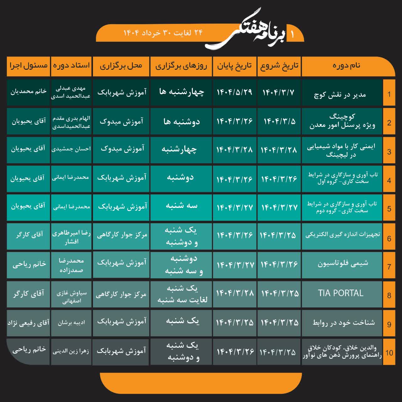 برنامه هفتگی دورههای آموزشی از ۲۴ لغایت ۳۰ خرداد 1404